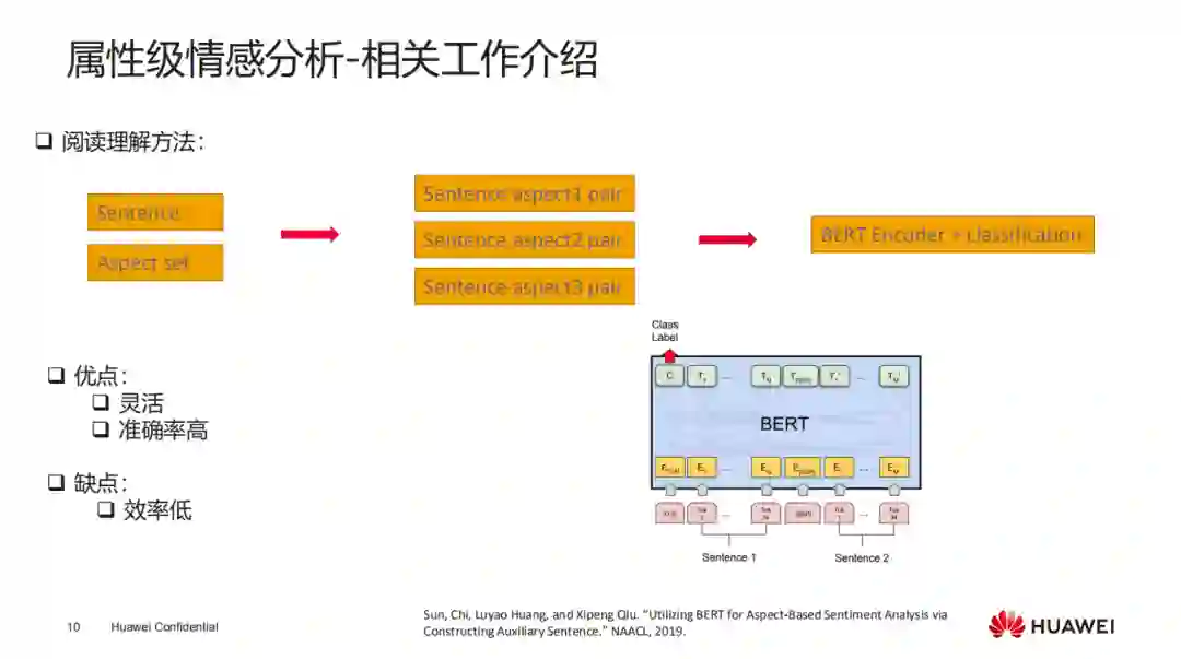 最近的一个工作是复旦邱锡鹏老师组提出的基于深度学习的方法,分析一个句子里面各个属性的正负面,他把这个问题转化成一个阅读理解的问题,本来一个句子有N个属性集合,他把句子和属性转换成句子-属性 pair。输入一个句子,这里面aspect可以描述成阅读理解的一个问你题,比如“针对外观评价是怎么样的”,这样转换成问答对的方式,然后基于Bert来识别这个问答对正负面的答案,这是一个比较新的工作。