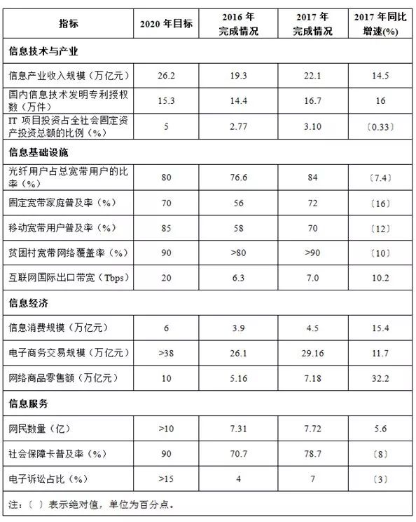 ——信息技术与产业方面。2017年,信息产业规模保持平稳较快增长,规模以上电子信息制造业同比增长13.8%,手机、微型计算机、网络通信设备、彩电等主要电子信息产品的产量居全球第一,电子信息制造业加速转型升级。软件和信息技术服务业继续呈现稳中向好运行态势,收入和效益同步加快增长,2017年完成收入5.5万亿元,同比增长13.9%,实现利润总额7020亿元,同比增长15.8%。技术创新能力大幅提升,信息技术发明专利授权数达16.7万件,已超额完成规划确定的2020年目标。通信业保持较快发展,电信业务总量达27557亿元,同比增长76.4%。