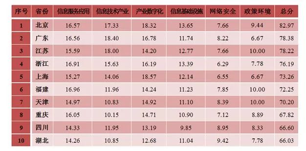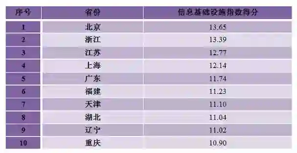 北京、浙江、江苏、上海、广东、福建、天津、湖北、辽宁、重庆等10个地方位列各省(区、市)信息基础设施指数排名前十位。上述地区大力推进城乡固定宽带网络建设普及,加快实施“光进铜退”改造,扩大4G移动通信网络覆盖,深入推进网络提速降费,全面落实电信普遍服务工作,区域信息基础设施支撑能力全面提升,数字红利有效释放。
