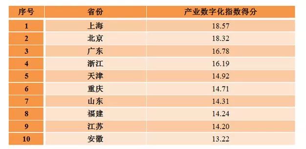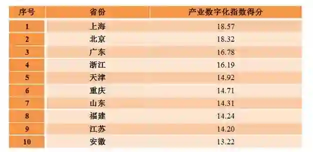 上海、北京、广东、浙江、天津、重庆、山东、福建、江苏、安徽等10个地方位列各省(区、市)产业数字化指数排名前十位。上述地区积极推动信息技术在制造业、农业、服务业深度应用,全面推进信息化和工业化深度融合,推动电子商务提档升级,创新产业生产模式和组织方式,带动产业资源灵活高效配置,产业数字化转型的创新活力和核心竞争力明显提升。