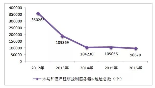 图7 2012-2016年木马和僵尸程序控制服务器IP地址数量对比