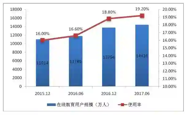图15 2015年底至2017年6月我国在线教育用户规模及使用率统计