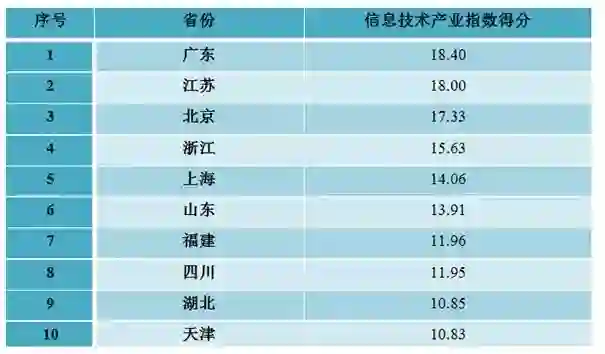 广东、江苏、北京、浙江、上海、山东、福建、四川、湖北、天津等10个地方位列各省(区、市)信息技术产业指数排名前十位。上述地区高度重视信息技术产业发展和生态体系建设,出台促进信息技术产业发展的相关规划和行动计划,强化信息技术创新带动作用,围绕产业链布局创新链,以创新链提升价值链,加快发展新一代信息技术产业,培育壮大电子制造业、软件与信息技术服务产业,推动大数据广泛应用于经济社会发展各领域,产业创新发展和辐射带动作用明显增强。