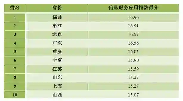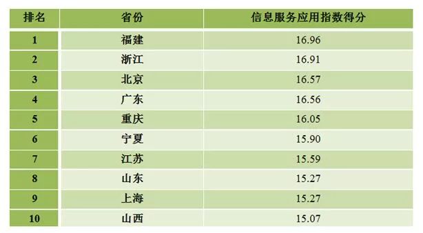 福建、浙江、北京、广东、重庆、宁夏、江苏、山东、上海、山西等10个地方位列各省(区、市)信息服务应用指数排名前十位。上述地区高度重视信息技术对公共服务效能的提升作用,推动互联网广泛普及,全面开展“互联网+政务服务”,让信息多跑路,群众少跑腿。积极推动教育、医疗健康、社会保障、文化等信息服务城乡覆盖,信息惠民便民深入发展,群众满意度明显提升。