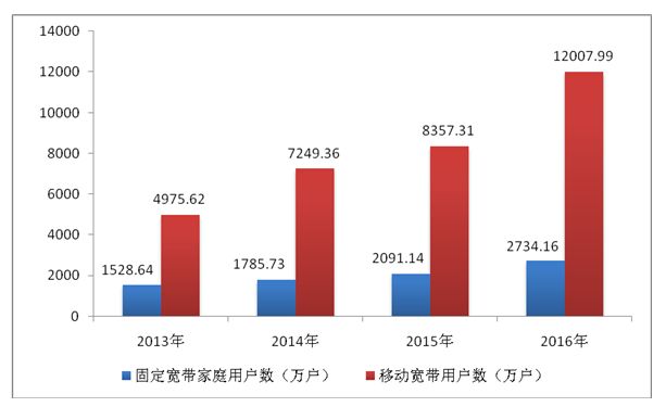 高速宽带网络加快建设。2017年,互联网宽带接入端口数量达到7.79亿个,固定宽带家庭普及率达到72%。光网城市建设驶入快车道,光纤宽带接入用户29392万户,全国50Mbps以上宽带用户占总用户比例超过70%,部分区域已经开始提供千兆宽带服务。移动宽带用户总数达11.3亿户,移动互联网接入流量246亿GB,同比增长162.7%,4G用户规模超过10亿。全国广播节目综合人口覆盖率98.71%,有线电视实际用户2.2亿户,其中有线数字电视实际用户1.98亿户,有线数字高清用户超过8900万户,全国直播卫星用户1.29亿户。空天一体化进程提速。2017年4月,我国首颗高通量通信卫星实践十三号发射成功,并于2018年1月交付使用。在轨测试期间,成功进行了国际首次高轨卫星对地高速激光双向通信试验。我国在轨民(商)通信卫星达到18颗。五年来新增10个国家级骨干直联点城市,国内网间互联带宽年平均增长42%。国际光缆通达30多个国家和地区,网络国际出口带宽7320180Mbps。农村及偏远地区网络覆盖快速提升。电信普遍服务深入推进,2017年,完成3.2万个行政村通光纤的任务部署,全国行政村通光纤比例超过95%。网民中农村网民占比27%,规模达到2.09亿,农村互联网普及率上升至35.4%。贫困村宽带网络覆盖率超过90%,已提前完成“十三五”规划确定的目标。网络提速降费持续推进。2017年第三季度,全国固定宽带用户网络下载的忙闲时加权平均下载速率为16.4Mbit/s,同比增长48.7%。固定宽带单位带宽平均资费、移动流量平均资费较2016年分别下降15.37%和35.50%。全部取消手机国内长途和漫游费。