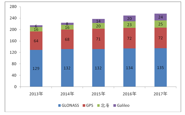 图9 2013-2017年全球四大卫星导航系统累计发射卫星数