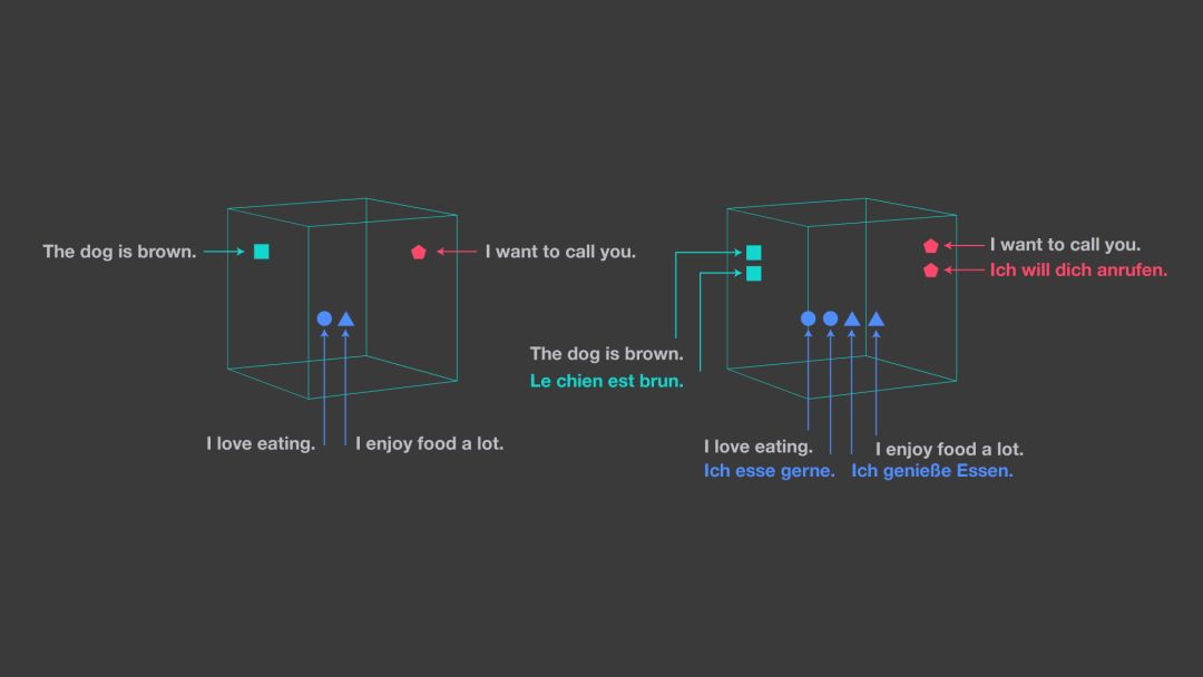 LASER 的句子向量表示对输入语言和 NLP 任务是通用的。该工具将任何语言的句子映射到高维空间中的一个点,为的是任何语言中的相同语句最终会出现在同一邻域中。该表示可以被视为语义向量空间中的一种通用语言。Facebook 观察到,该空间中的距离与句子的语义接近度非常相关。(见下图,图左显示的是单语嵌入空间,图右说明了 LASER 的方法——将所有语言嵌入到同一共享空间。)