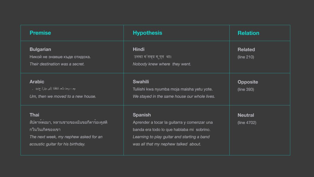 与之前需要句子为英语的方法相比,该系统是完全可以多语言的,并且支持不同语言的前提和假设的组合。下表显示了 LASER 如何能够确定不同语言的 XNLI 语料库中句子之间的关系,而以前的方法只考虑了同一语言的前提和假设。