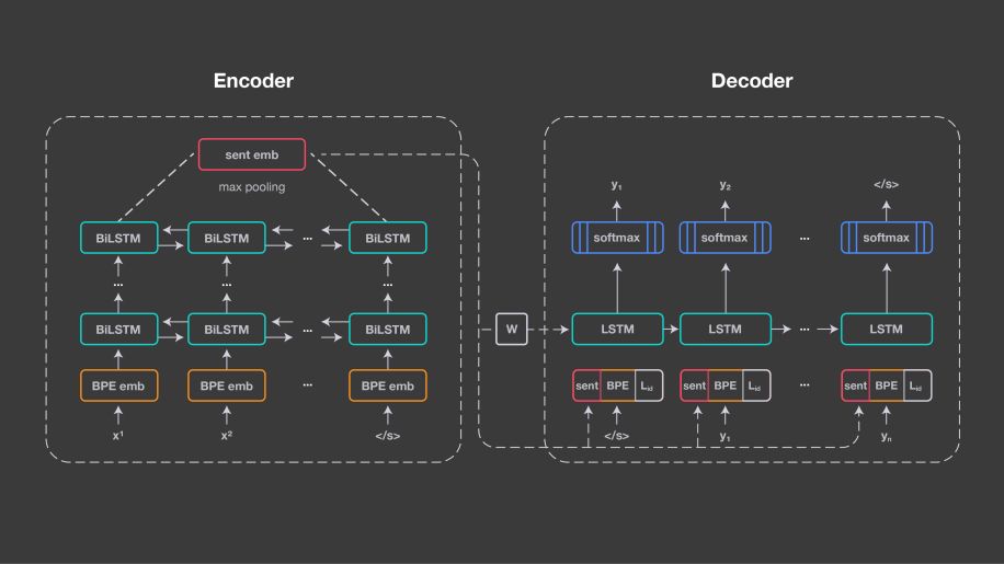 LASER 的方法建立在与神经机器翻译相同的基础技术之上:编码器/解码器方法,也称为序列到序列处理。Facebook 为所有输入语言使用一个共享编码器,并使用共享解码器生成输出语言。编码器是五层双向 LSTM(长短期记忆)网络。与神经机器翻译相比,Facebook 不使用注意机制,而是使用1024维固定大小的向量来表示输入句子。它是通过对 BiLSTM 的最后状态进行最大池化来获得的。这使得句子表示能够被比较并直接输入到分类器。下图说明的是 LASER 的结构。