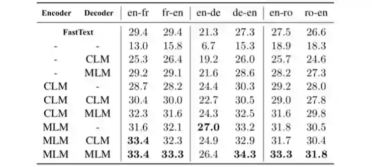 在BERT中,每个样本是用一种语言构建的。XLM对它的改进是每个训练样本都包含两种语言的相同文本。与BERT一样,该模型的目标是预测被屏蔽的词,但采用新的体系结构,该模型可以使用一种语言的上下文来预测另一种语言的词。因为不同语种的被屏蔽词是不同的(随机)。改造后的BERT表示为翻TLM(Translation Language Model),而带有BPE输入的“原始” BERT表示为MLM(Masked Language Model)。通过训练MLM和TLM并在它们之间交替进行训练来训练完整的模型。