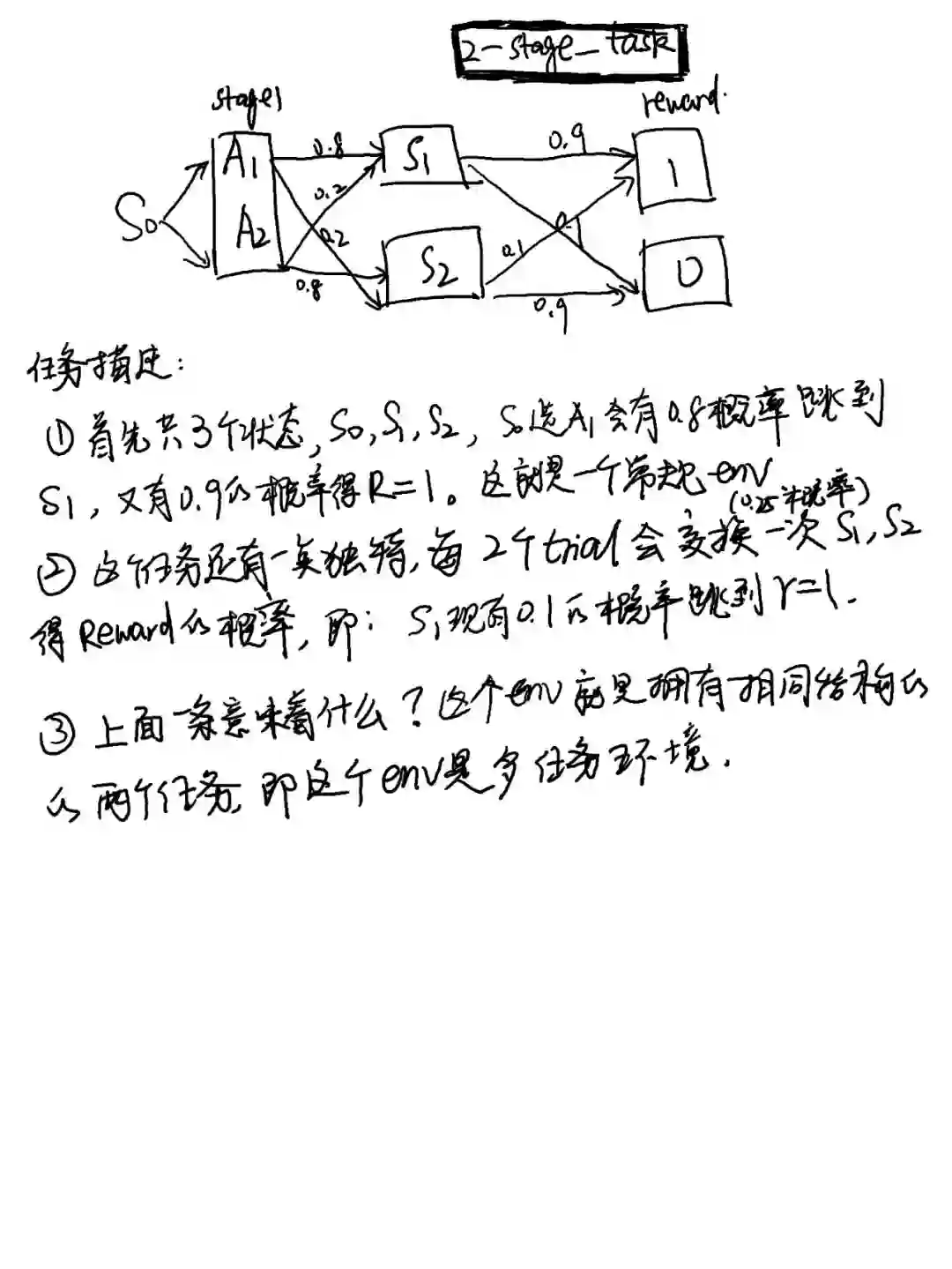 当有一个新的序列输入时候,模型能分辨出这是哪一个任务,从而得出接下来该执行什么动作。更具体地说:比如上一个奖励是1,动作是A1,经过这个模型它能知道这个奖励是通过common 还是uncommon transition 得到的,(s0到s1再到奖励1是大概率跳转时称为common transition,是通过小概率跳转得到的奖励成为uncommon transition).因此,当通过模型知道奖励1是通过common transition得到时,模型知道接下来要多重复这个动作能得到更多奖励(论文中重复概率称为stay probability )。同样地,如果执行动作A2也得到奖励了1,但是模型学会了这是uncommon transition,它不会重复A2这个动作。同样都是得到奖励1,通过这个模型才可以知道该不该跟着干这个动作以或者更多奖励。 这就是这个模型要学到的最终效果,这个任务的效果,从另一个角度来说,是用RNN达到了world base的效果,尽管它并没有训练一个world 模型。