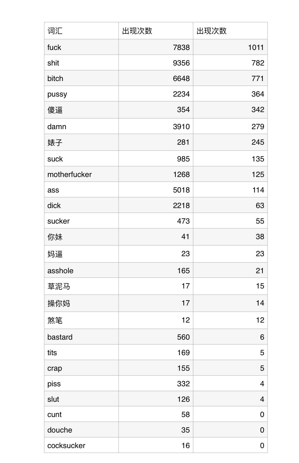 这个统计有个小插曲,第一次统计发现一个中文脏话都没有,还以为净网运动成功了,结果发现分词的词库里压根就没脏话的词汇,重新手动加入词库后就好了。