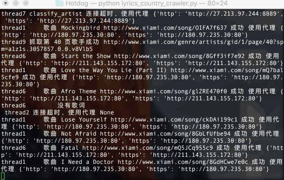 选定虾米音乐之后,写了好一会代码,抓取歌词的爬虫开始蹭蹭工作了 ⇣
