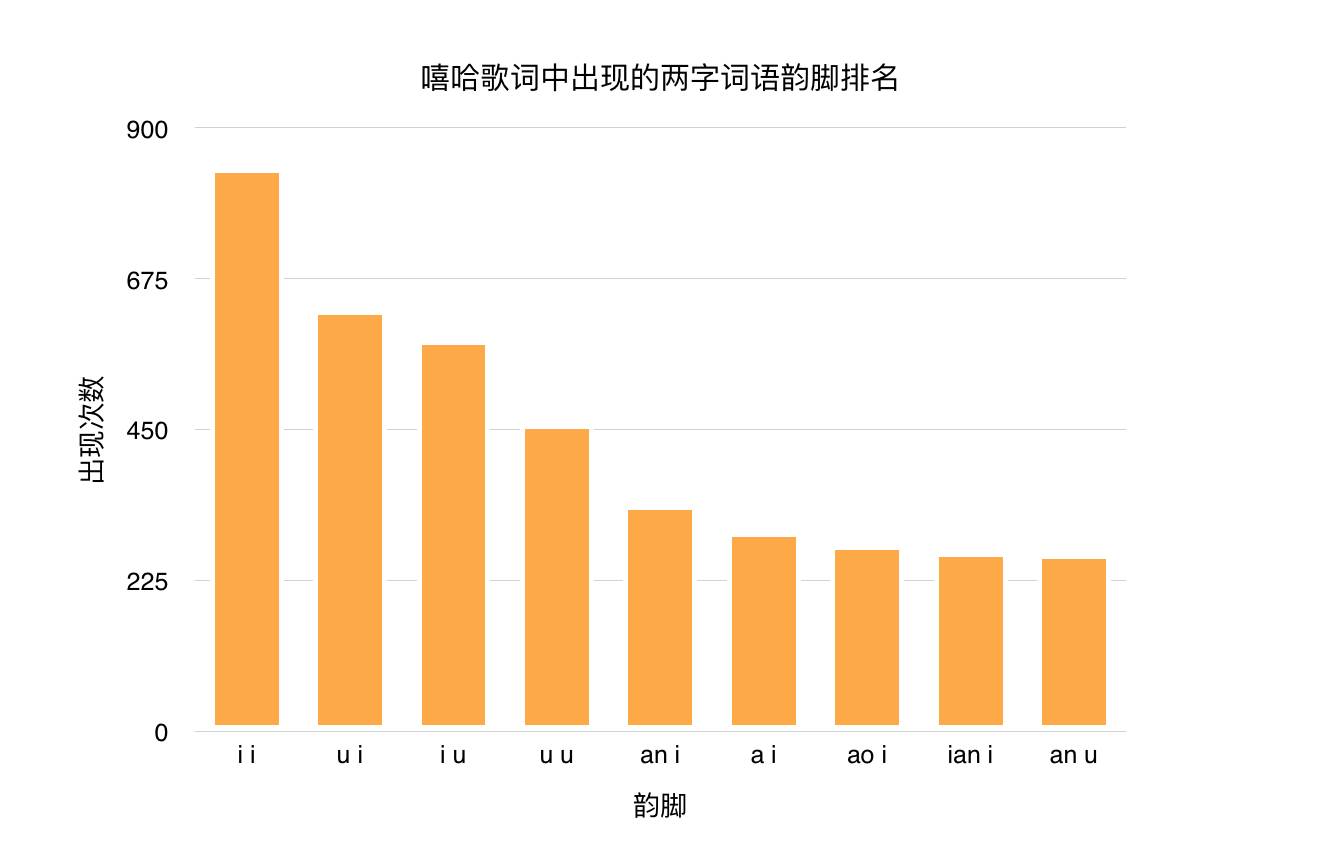 韵脚的分布挺有趣的,我统计了一下出现前十的两字词语韵脚 ⇣