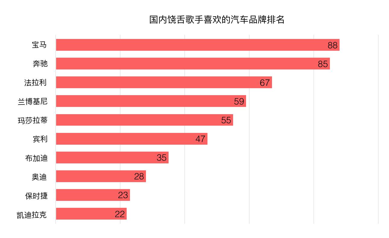 这是各汽车品牌在国内16284首嘻哈歌曲中出现的情况,在一首歌的歌词中出现算一次,总共约有400多首歌中出现至少一次汽车的品牌名字。可以看出,饶舌歌手喜欢宝马和奔驰的很多,特点只有一个,就是贵!其实夏利、桑塔纳等车也有不少歌提到,但一般表达的是消极情绪。