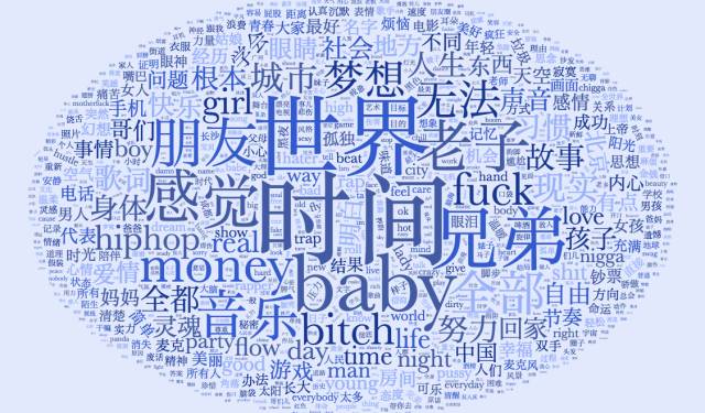 “世界”和“时间”占据首位,“老子”、“兄弟”、“baby”、“money”、“bitch”、“real” 等词倒是让 rapper 的形象呼之欲出。rapper 的词里频繁提到“音乐”、“歌词”、“旋律”、“歌曲”,可见他们对自己的音乐非常在乎。嘻哈音乐由于有 freestyle 的文化,对亲自写词有要求,否则就不 “ real ” ,从节目中他们对偶像 rapper 的 diss 也能看出来。
