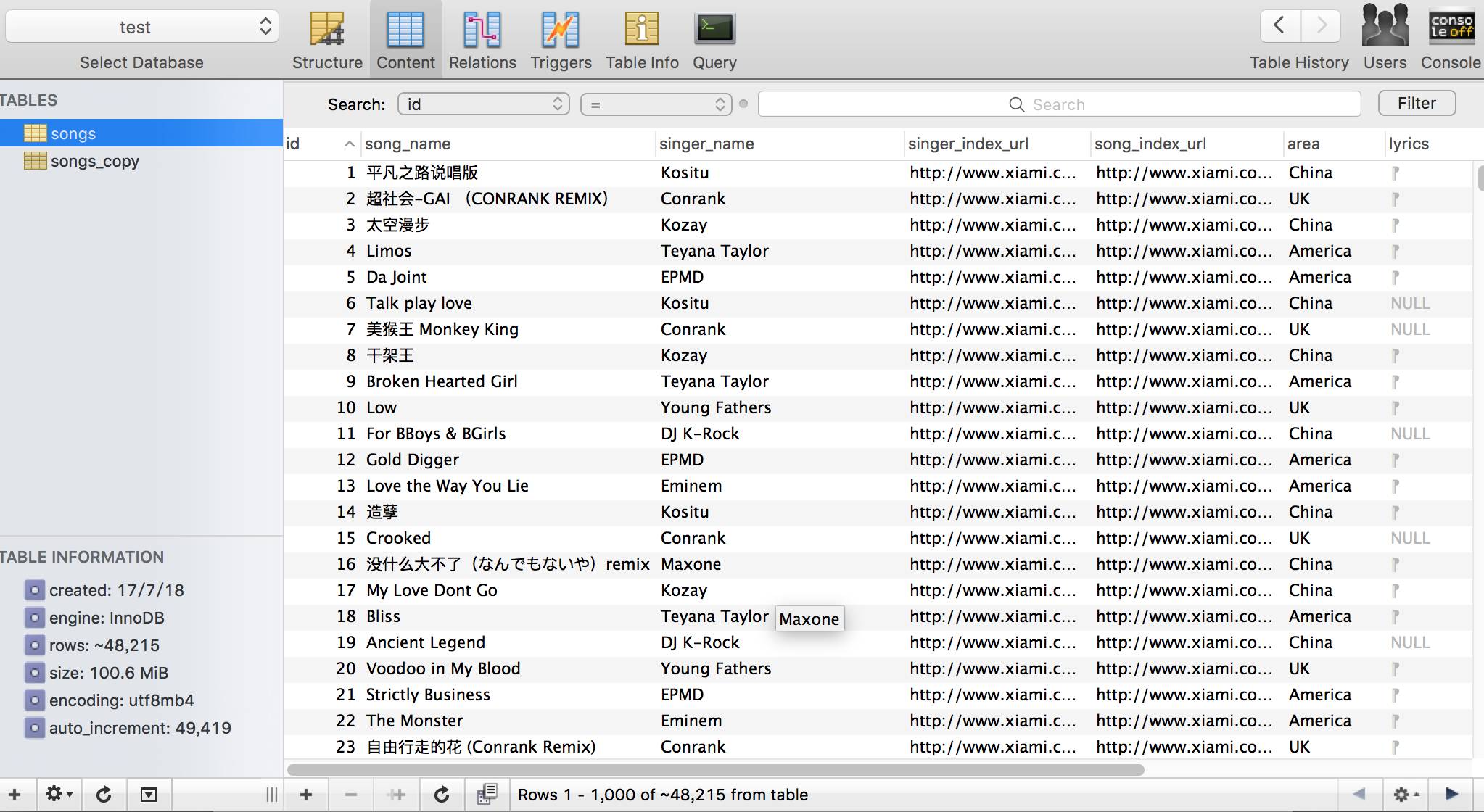 然后在三小时之后,我收获一个约100M,49419首歌的数据库。