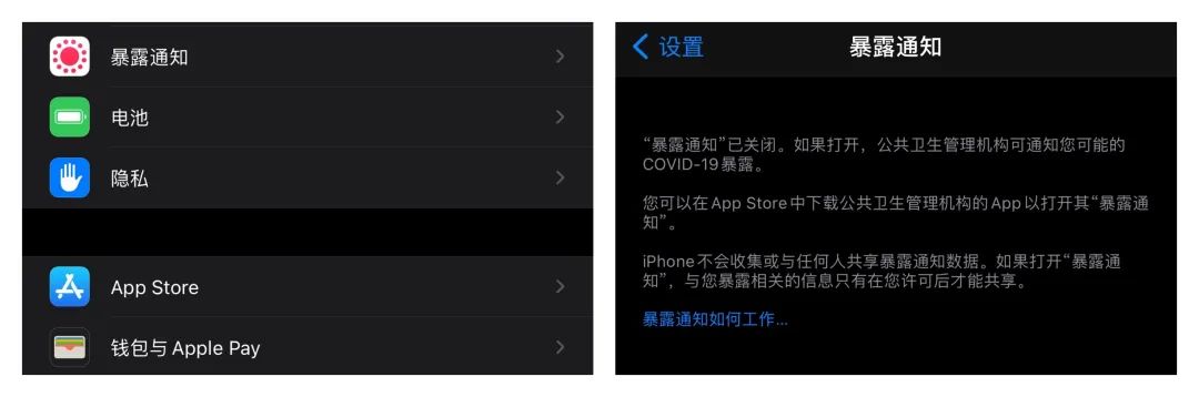 在此版本「设置」首页中,新增了「暴露通知」选项,用户可以下载有关 App 以打开「暴露通知」选项。未下载相关 App 时,该选项处于关闭状态。