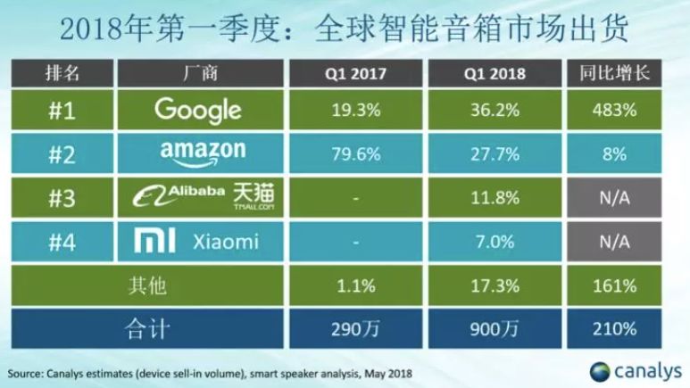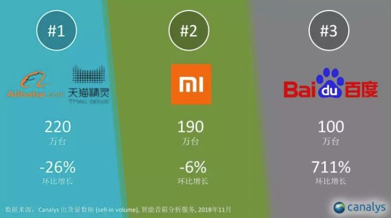 Canalys 发布的 2018 Q1 全球智能音箱报告显示,阿里巴巴天猫精灵以 110 万出货量排到全球第三,中国第一。