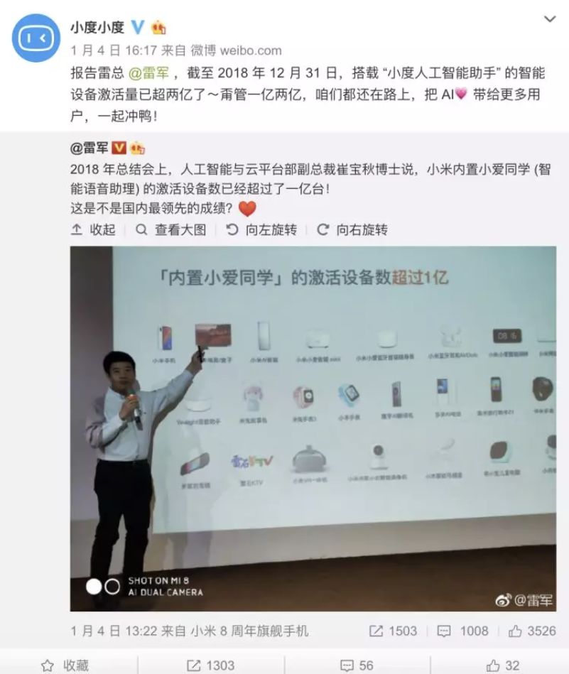 2018 年 11 月底的小米 AIOT 开发者大会上,雷军表示搭载小爱同学的累计激活设备数约 1 亿台,累计唤醒次数 80 亿 +(包括小米手机在内),月活跃用户数 3400 万 +。百度的 DuerOS 不遑多让,截至 2018 年 12 月 31 日,搭载 DuerOS 的智能设备激活量超过 2 亿。