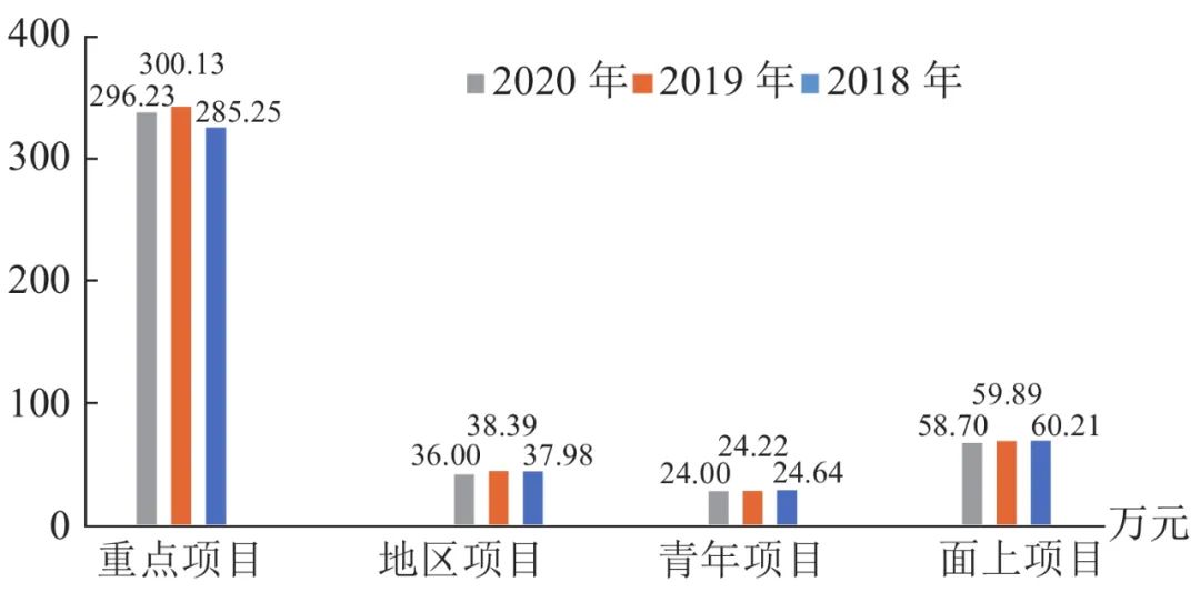 从平均资助强度 (图4) 上来看, 2020年度由于新冠疫情的影响, 面上项目、青年项目、地区项目和重点项目的资助强度较前一年均有一定幅度的缩减, 分别为−1.19万元/项、−0.22万元/项、−2.39万元/项和−3.9万元/项. 但面上项目、青年项目和地区项目的平均资助强度变化程度较小, 也显示出常规项目在资助额度上的差异会越来越小.