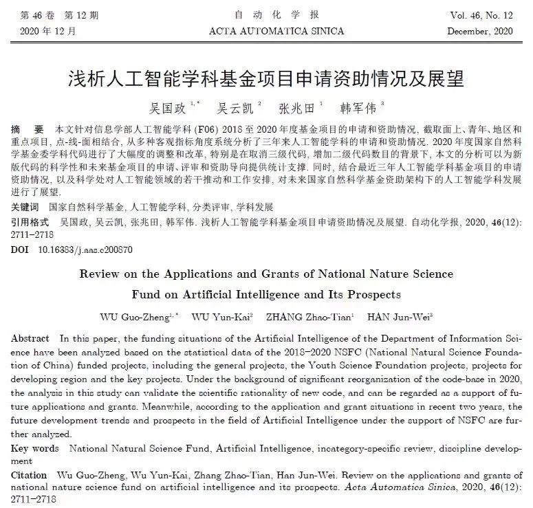 自动化学报最新一期刊登来自吴国政,吴云凯,张兆田,韩军伟撰述的《浅析人工智能学科基金项目申请资助情 况及展望》,是申报F06方向项目值得参考的指南。