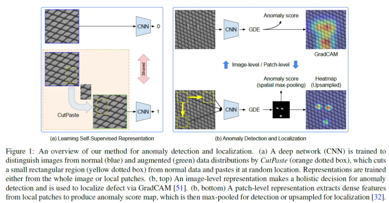 A:自然演进  cutout—cutpaste+B:既有方法  将自监督学习的pretask应用于异常检测+C:细节创新   高斯概率密度估计(GDE)判断异常