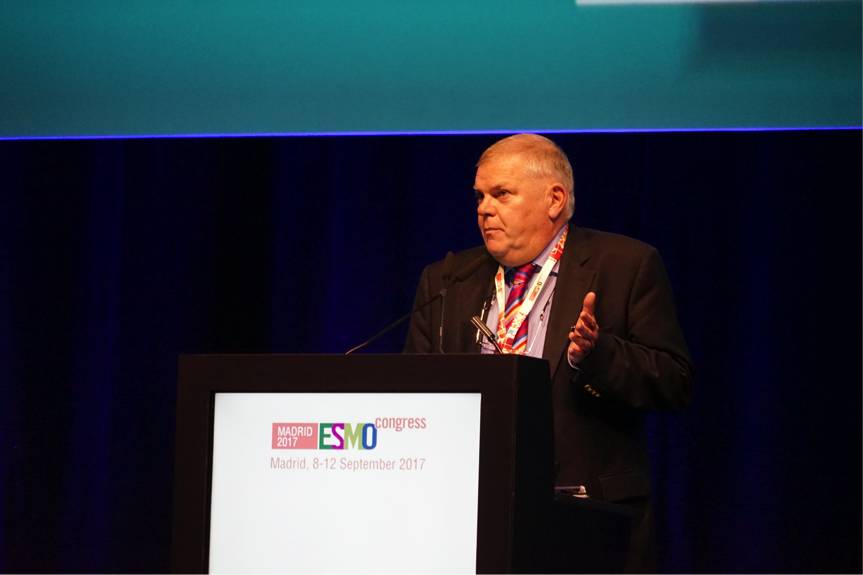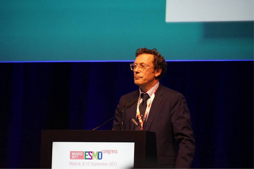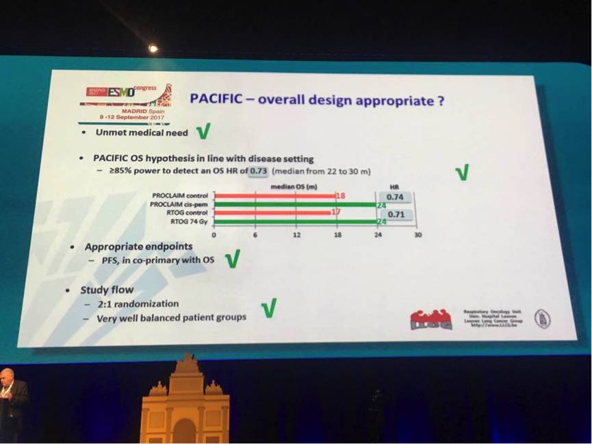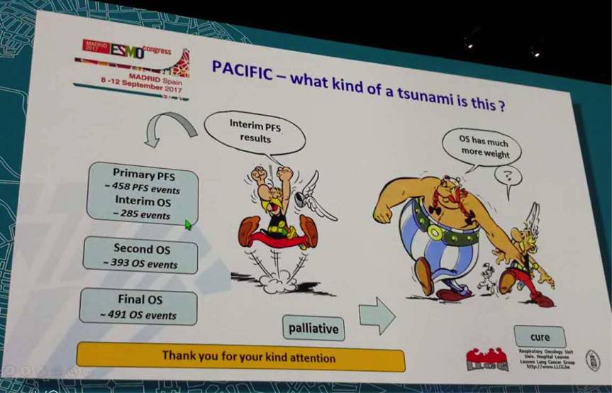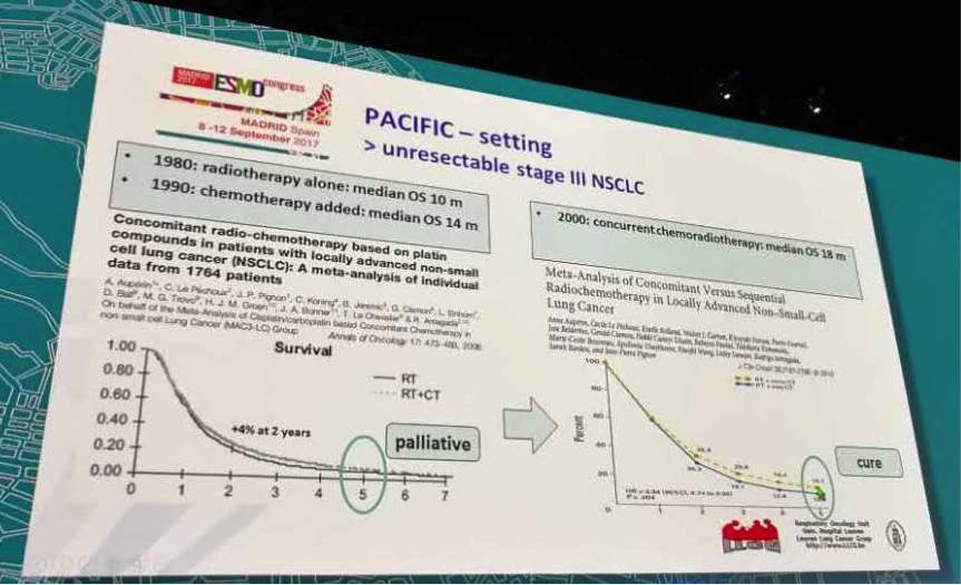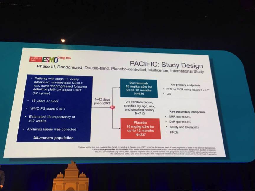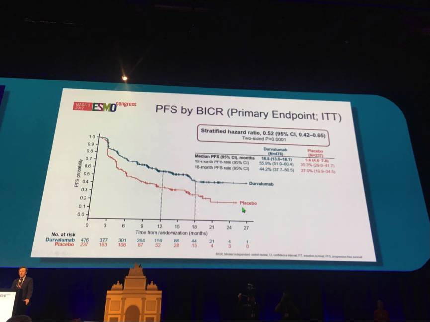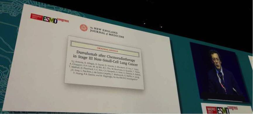 ESMO 2017大会第二天的主席研讨会上,III期临床试验PACIFIC结果正式发布,在无法手术切除的局部晚期(III期)非小细胞肺癌患者,在接受标准含铂的同步放化疗 (CRT) 后,未发生疾病进展患者,与目前标准治疗相比,Imfinzi (durvalumab) 维持治疗对比安慰剂,可以显著延长 PFS 达11个月,Durvalumab是第一个对于III期NSCLC患者证明有PFS显著获益的免疫检查点抑制剂。大会现场,PACIFIC试验Luis Paz-Ares教授汇报了研究结果,Johan Vansteenkiste教授进行了现场点评。