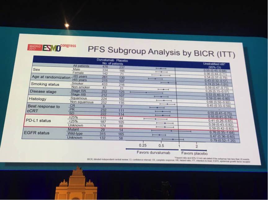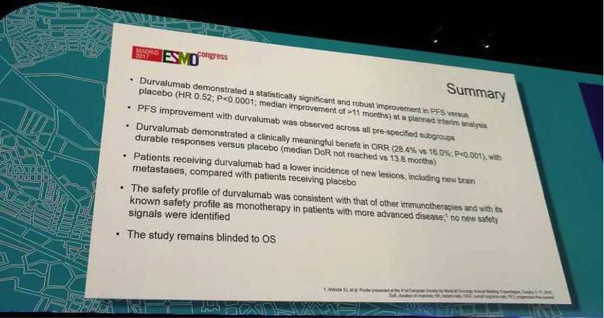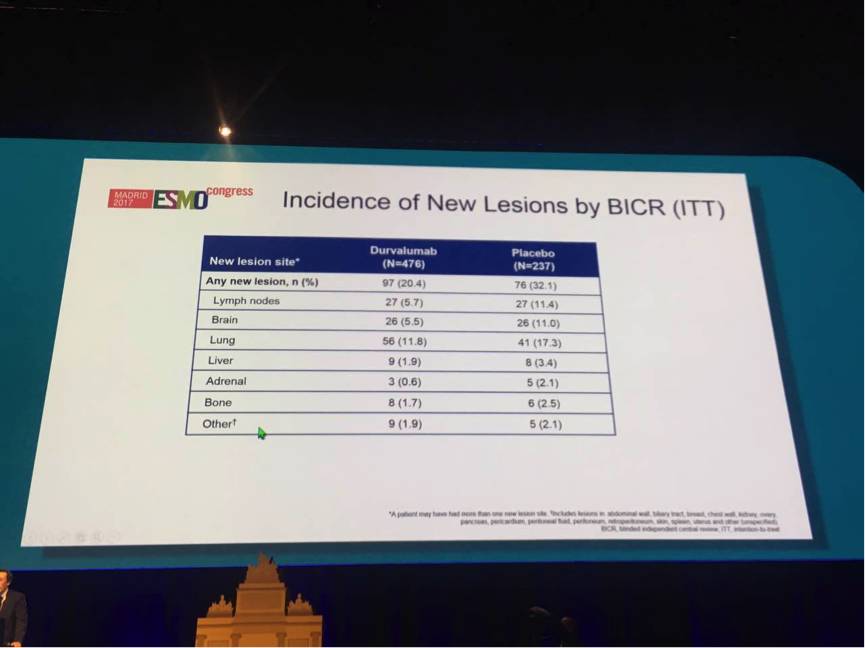 在预设的所有亚组(包括PD-L1表达状态)中,均观察到Durvalumab组PFS的获益。此外,使用Durvalumab的患者与服用安慰剂的患者相比,发生肿瘤转移的风险更低。