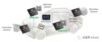 APACHE4加入了专用检测引擎,支持行人检测、车辆检测、车道检测和移动物体检测四种监测类型。嵌入其中的CEVA-XM4图像和视觉平台可让APACHE4的客户使用高阶软件编程来开发差异化的ADAS应用,具体应有如下图,在车辆系统的前后左右都有图像采集系统,搭配一颗APACHE4,并将采集数据送入到图像分析系统ECU,并将分析结果送入汽车操控系统。