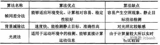下面介绍下机器视觉中的运动目标检测图像算法,该方法是运动物体识别和跟踪的基础。移动物体的检测依据视频图像中背景环境地不同可以分为静态背景检测和动态背景检测。由于篇幅有限,我们这里只介绍静态背景检测算法。常见的静态背景目标的检测算法包括帧间差分法、背景减除法、光流法等。这些背景不变算法的优缺点描述如下表二。