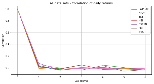 print('Correlations of daily returns between datasets:')