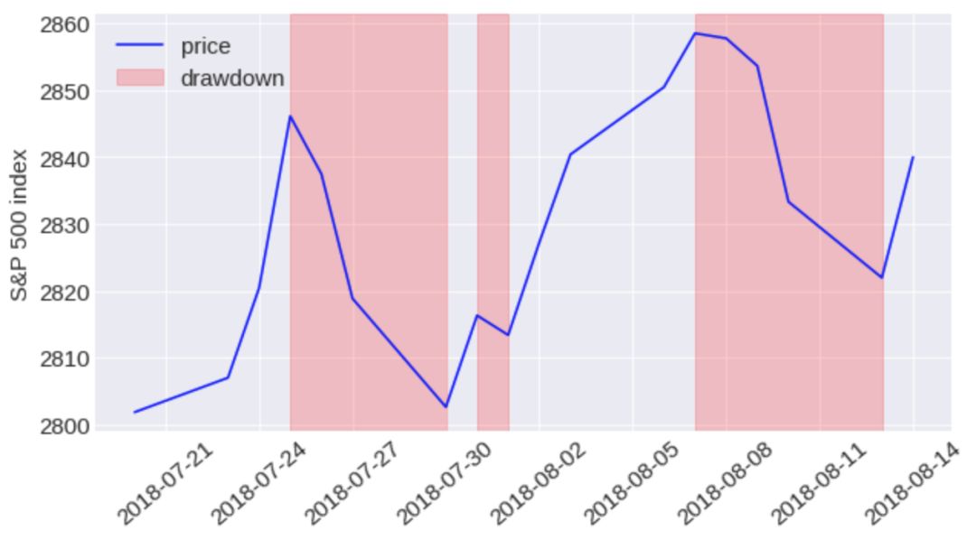 为了识别每个数据集中的市场崩盘情况,首先计算了股价“下跌”情况。“下跌”的定义(图示红色部分)是从往期的最后一个价格最大值到下一个最临近的价格最低值的持续下降的连续天数。下面的例子显示了标普500指数在2018年7月底至8月中旬的三次下跌。