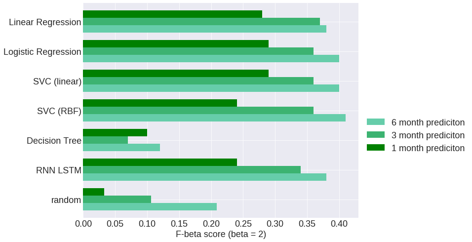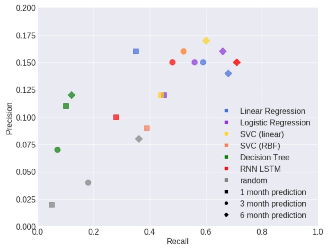 上面的图显示了不同模型的查准率和查全率。不同的颜色表示不同的模型,不同的形状表示不同的预测变量(1、3或6个月内出现的股市崩盘)。下面的条形图可视化了所有模型的F-β分数,用于1, 3个月和6个月的股市崩盘预测。random代表模型的期望表现,其没有如同先前已被测试的模型那般能够预测那么多次股市崩盘的预测能力。