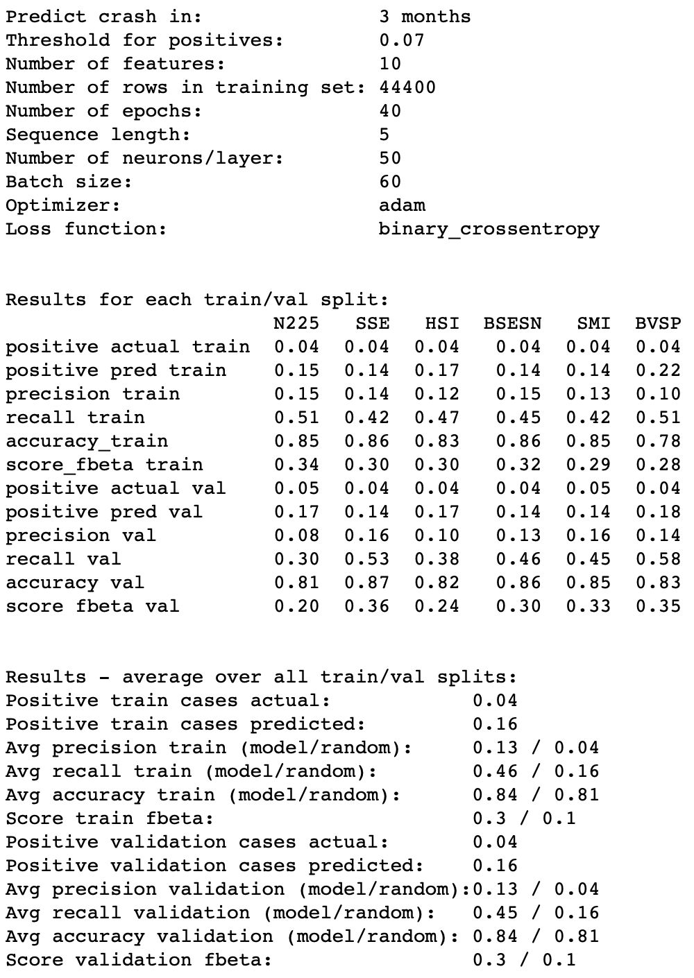 最优结果表明,针对于预测6, 3和1个月内的股市崩盘,F-β分数分别为41, 37和29。查准率在12%到16%之间,查全率在45%到71%之间。这意味着,当检测到当大约50%的股市崩盘事件被预探到时,其中约85%的股市崩盘预警信号是“假预警”。