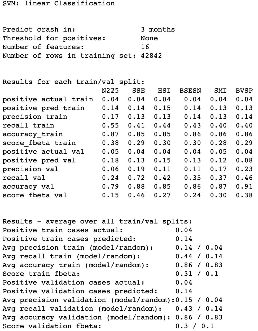 SVM: linear Classification prediction of a crash within 3 months: 0.79