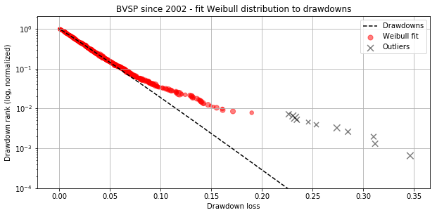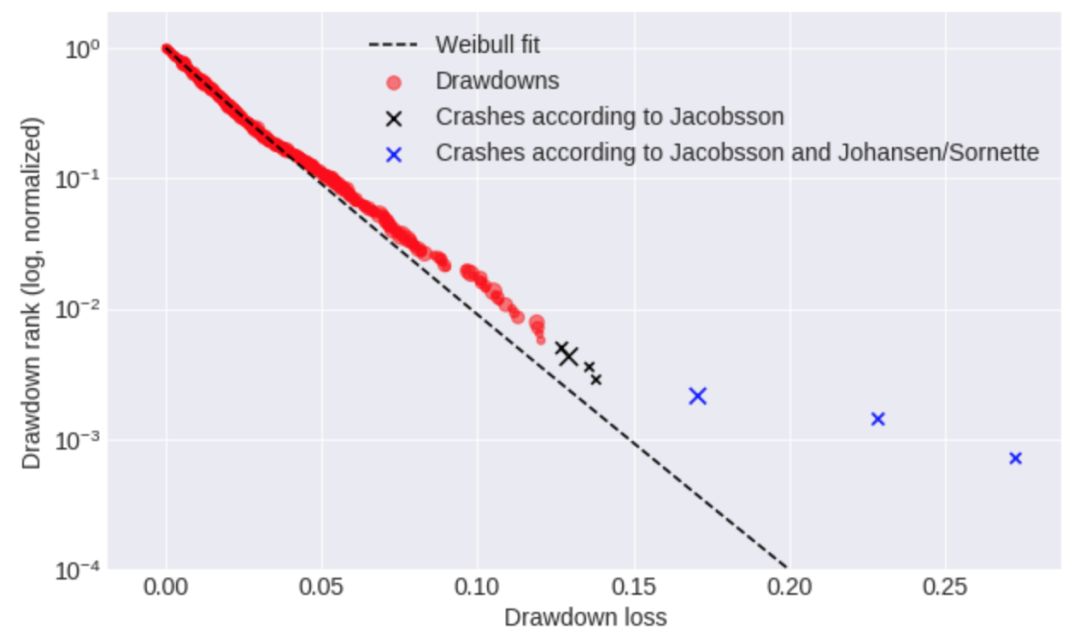 基于上述方法,我发现了将“下降”进行分类的阈值,从标准普尔500指数等波动性较小的市场的约10%到巴西(巴西综合股票指数(巴西))等波动性较大的市场20%以上。第二种方法遵循Johansen和Sorrn的建议,Johansen和Sorrnette将崩盘识别为异常值,异常值的定义即为当绘制数据集中下降序列的对数与下降幅度的关系时,远离拟合Weibul分布的那些“下降”。