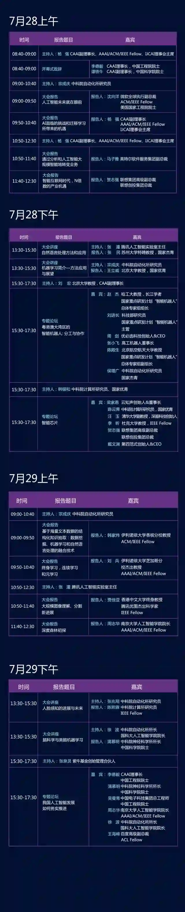 本届CCAI2018将汇聚超过40位顶级人工智能专家,围绕“机器学习”、“人脸识别”、“自然语言处理”和“脑与认知”等前沿话题进行交流、探索,内容分为8个大会报告,4个大会讲座和3个专题论坛。大会将充分展示AI新科技、助力新动能、壮大新经济,进一步打造高端交流合作平台,促进AI和实体经济深度融合,引领科技创新发展。