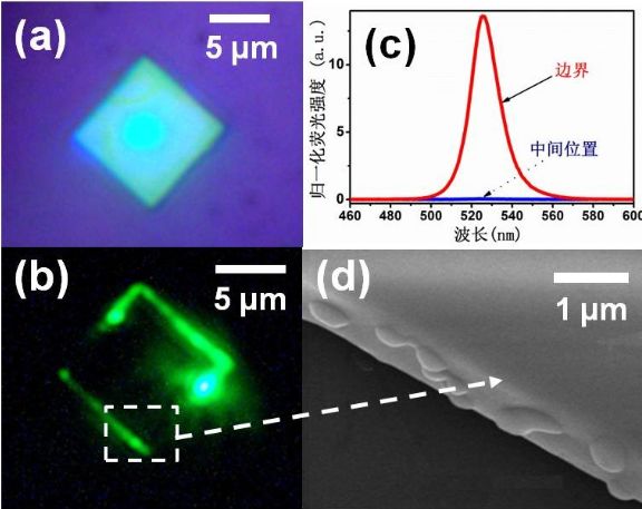 图1 CsPb2Br5纳米片的光学显微照片(a, b)、显微荧光光谱(c)和扫描电子显微照片(d),(a)图纳米片中间位置上浅蓝色亮点为473 nm激光光斑