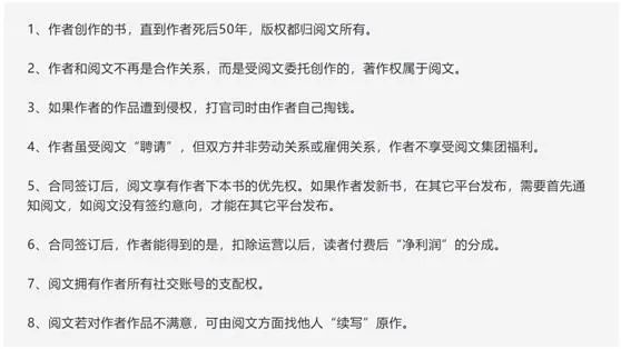再回过头来看看,究竟阅文霸道在哪?新浪财经针对作者们的控诉和合同条约,总结出了图片所示的几条关注重点: