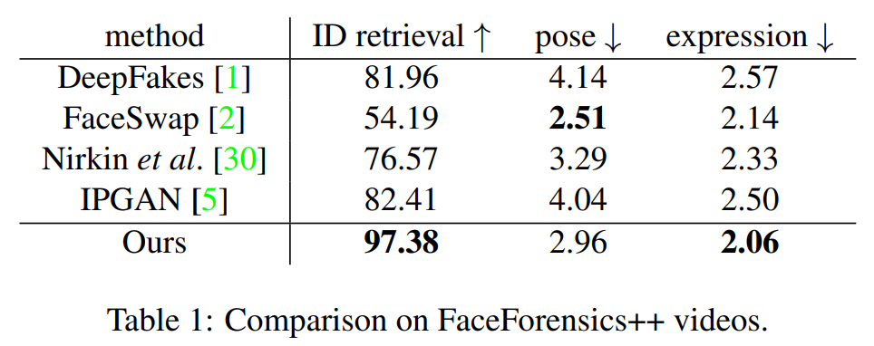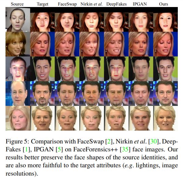 图 5 展示了我们在 FaceForensics++数据集上与 FaceSwap [2], Nirkin et al. [30], DeepFakes [1] 和 IPGAN [5] 的比较。
