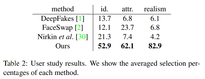 由于 FaceSwap [2], Nirkin et al. [30], DeepFakes [1] 和 IPGAN [5] 的策略都是先生成脸部区域图像,然后将其嵌入到目标脸中,我们可以从比较中明显的看出这些方法的嵌入误差。
