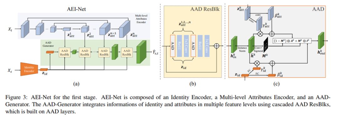 为了实现高保真的人脸交换结果,在框架的第一阶段,我们设计了一个基于 GAN 的网络以对目标属性进行彻底的自适应集成,并称之为自适应嵌入集成网络(Adaptive Embedding Integration Network,AEI-Net)。