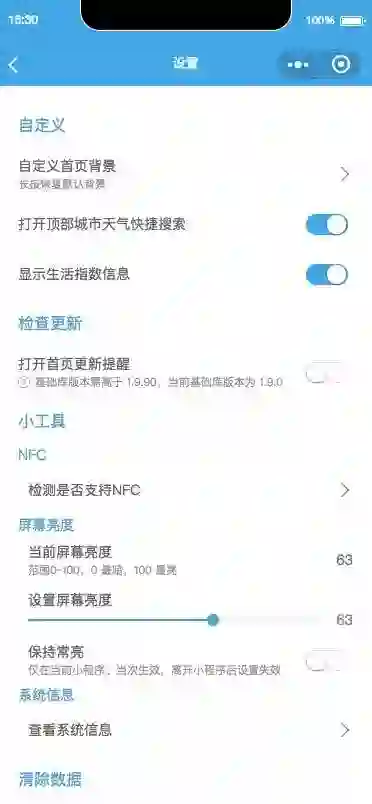 设置页的功能看着有点多,其实并不多,只是一堆 API 的调用。这个页面分了自定义、检查更新、小工具、清除数据三个部分。各个设置参数保存在 Storage 中。一个一个来说。
