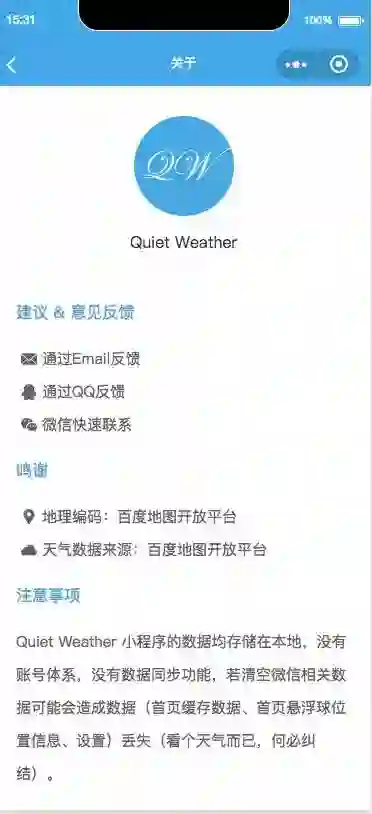 关于页是一个展示页,没有多少交互,使用到的 API 只有复制到剪切板 wx.setClipboardData。“微信快速联系”使用的是小程序提供的联系客服的方式。有精力的话,可以自己搭建服务,将小程序的消息 Push 到自己的服务上去。效果图:
