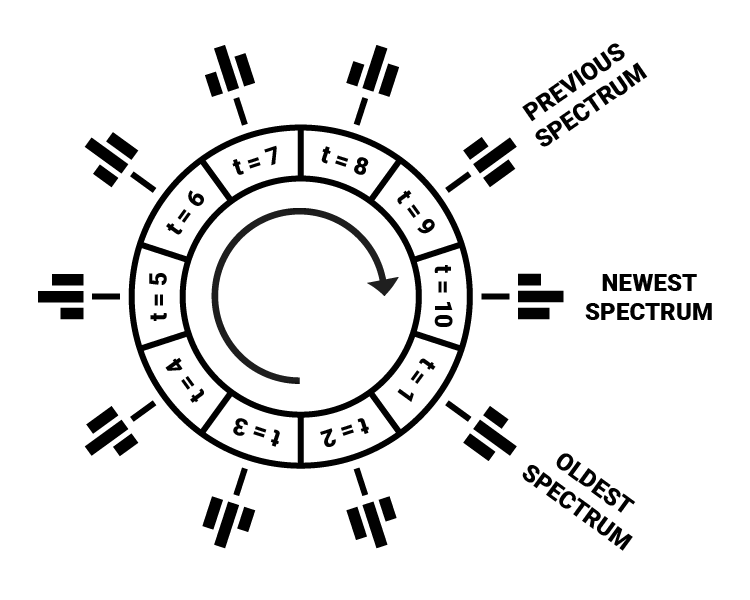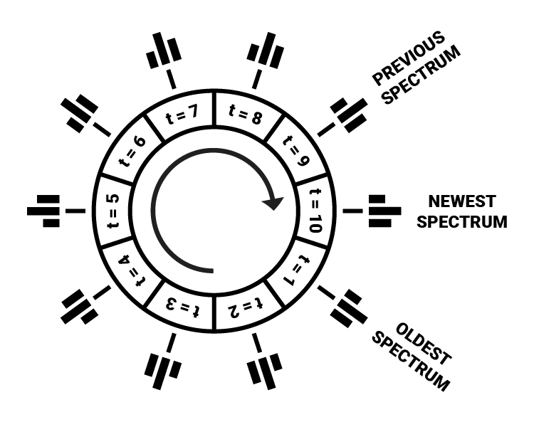 在我们的例子中,可以使用一个长度由所需记忆量决定的多维数组,环形缓冲区的每个索引指向某一特定时步的完整频率频谱。计算出新频谱后,将其写入缓冲区,如果缓冲区已满,就覆盖最旧的时步。