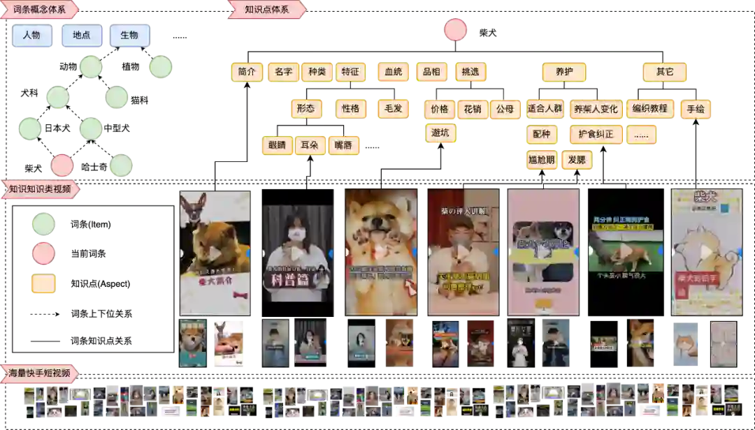 参考国家标准 [2] ,我们将事实(What)、原理(Why)类知识归结为科普知识,技能(How)类归结为教程知识,在快手海量的视频中挖掘出高质的知识视频。此外,我们将短视频中抽取的知识主体以词条形式呈现(如柴犬),并抽取视频中讲解的该词条具体的知识点(如柴犬 - 挑选、柴犬 - 护食纠正等),最终构成了一个短视频的百科知识体系,如图二所示。