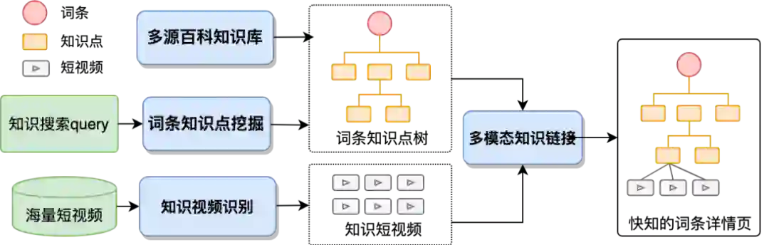 1. “快知”的定义:我们开创性地定义了一个全新的多模态知识百科库,以词条、知识点、知识类短视频以及它们间的关系共同构成。这是业界首个结构化的多模态短视频百科。