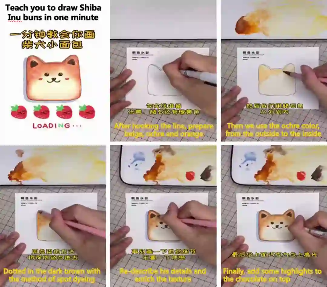 百科全书(Encyclopedia),可以追溯到希腊和罗马,也是 17-18 世纪法国启蒙运动的一个杰出成果。知识百科通常是指概要介绍人类全部知识或某一特定领域或学科的工具书或纲要,在互联网急速发展的当下,网络百科成为知识新的载体,如维基百科、百度百科等。但这些百科通常以图文、表格为载体,比较难以表达一些需要生动演示的知识,比如教程(How-to)类知识。图一展示了使用图文讲述 “柴犬”-“怎么画” 这一知识的困境。而通过短视频,我们能够很好地对这些知识进行一个阐释和学习。