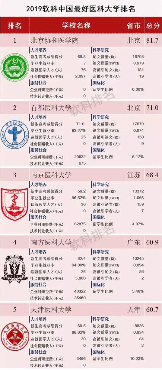 作为大学分类排名,2019年入选中国最好医科大学综合排名的学校数量共71所。除北京协和医学院领跑之外,首都医科大学排名第二,南京医科大学、南方医科大学和天津医科大学位列前五。之后,依次为:中国医科大学、哈尔滨医科大学、上海中医药大学、重庆医科大学、大连医科大学。